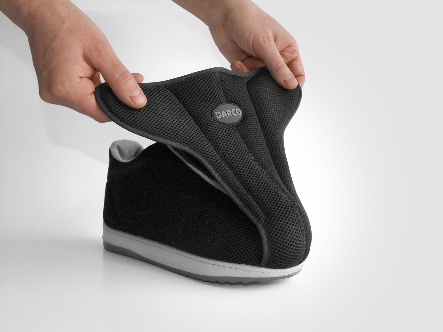 Choice of shoe size is significantly influenced by foot swelling and volume of bandages/cast worn in conjunction with a DARCO shoe. To ensure the best fit, measure the widths and length your injured foot (including any dressings) and select the best shoe size using the graphic below.